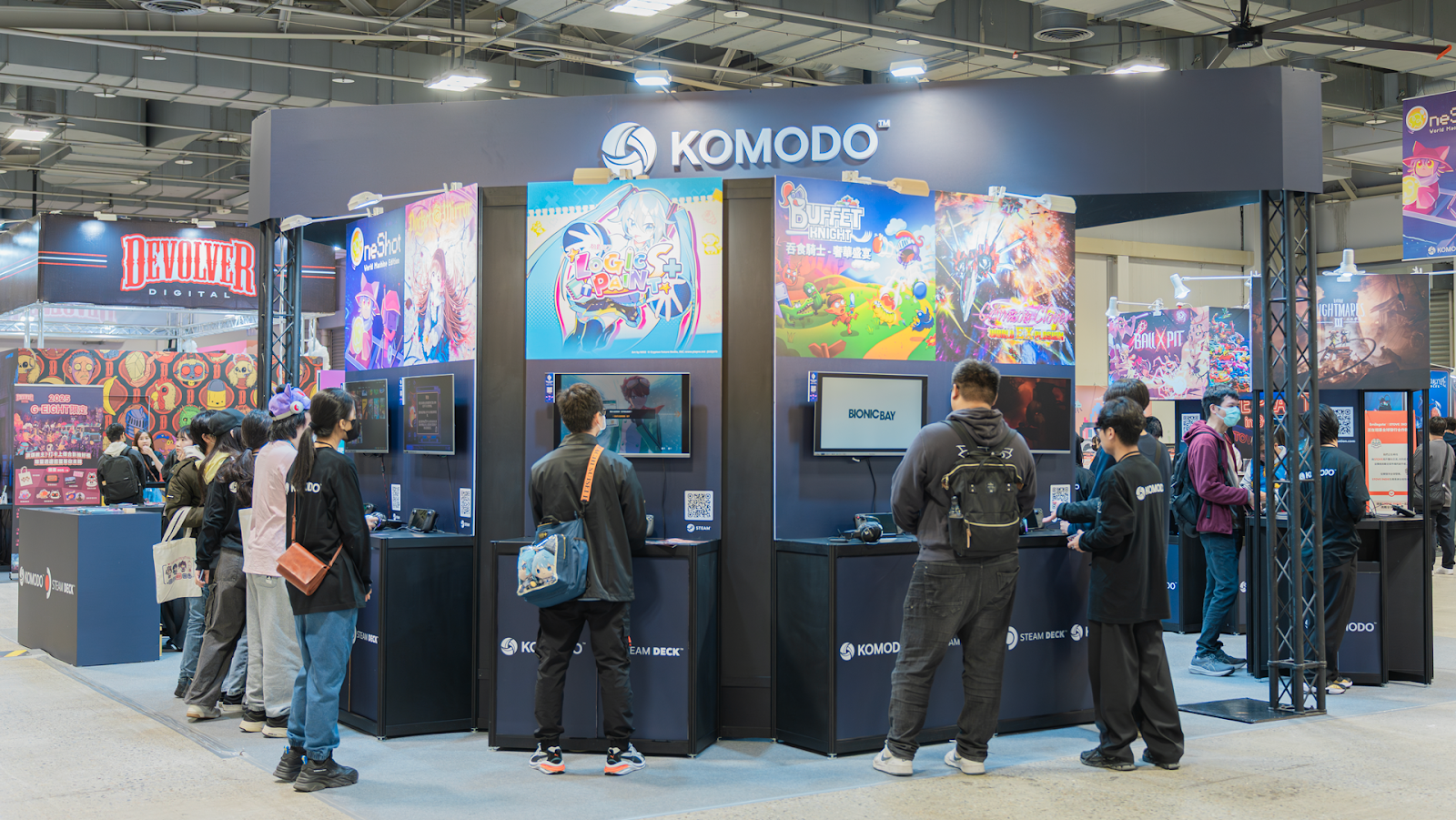 集英社遊戲推出體驗最新試玩內容,即可獲得限量周邊。KOMODO攤位有「KOMODO 遊戲挑戰」能有機會帶走市價NT$1,000的Steam Wallet Code。Devolver Digital邀請玩家挑戰Speed Run,提供限量周邊與布偶裝合照。《桃源深處有人家》販售可愛蘿蔔周邊。Smilegate - STOVE參加試玩便可以獲得幸運抽獎資格。SIGONO攤位則推《OPUS:心相吾山》限定「小漣&狗狗」壓克力立牌周邊。