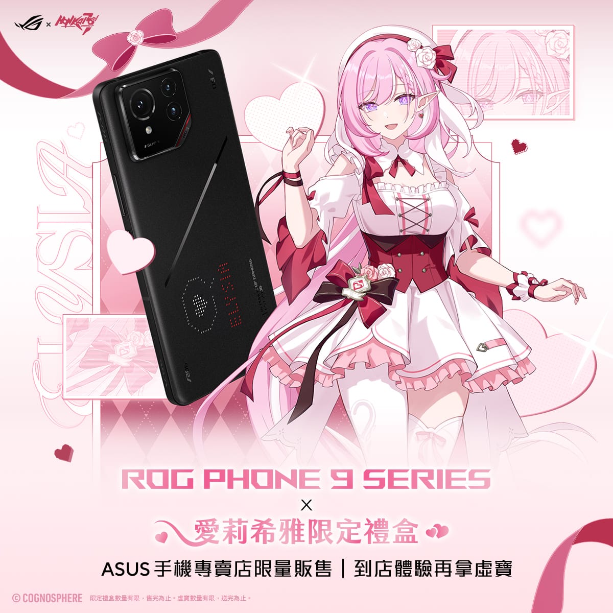 ROG 旗下 AI 電競手機 ROG Phone 9 系列 與知名手遊《崩壞 3rd》聯名,推出以人氣角色「愛莉希雅」為主題的限定禮盒,以粉色浪漫風格呈現「電競 × 二次元」的跨界魅力。